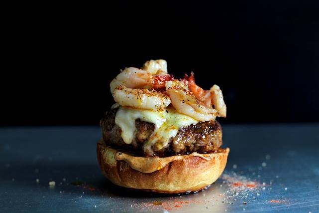 Apply a good layer of paprika mayo on both sides of the buns, then put 2 thinly sliced tomatoes and a chorizo patty on top. Slice the shrimps/prawns lengthwise and place over the patty. Close it off with the top bun. I warn you, it’s going to be very messy and drippy… and happy.