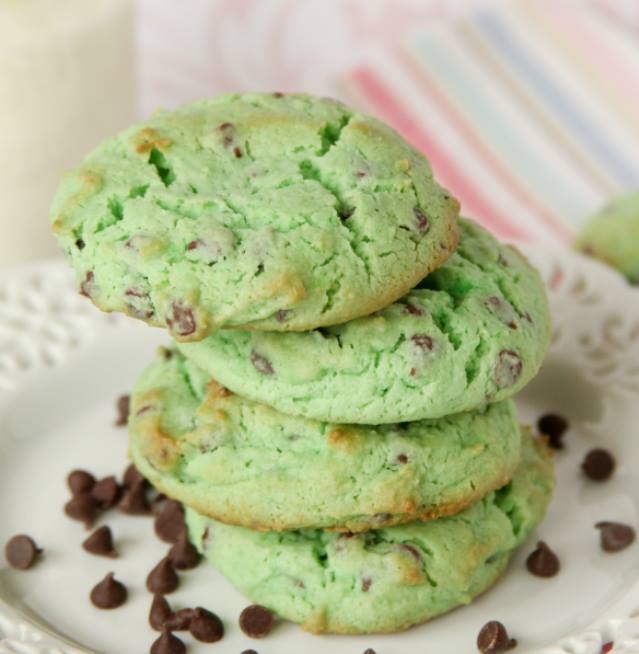 In the bowl of a mixer, beat butter and cream cheese until smooth. Add cake mix, egg, extract, and food coloring and beat on medium until combined. Fold in chocolate chips.
